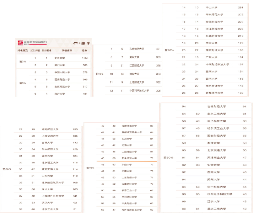 2022年9月21日,高等教育评价专业机构软科正式发布“2022软科中国最好学科排名”。排名榜单包括96个一级学科,各个学科排名的对象是在该一级学科设有学术型研究生学位授权点的所有高校,发布的是在该学科排名前50%的高校。共有484所高校的5035个学科点上榜。其中,统计学学科排名共有68所大学上榜,正妹