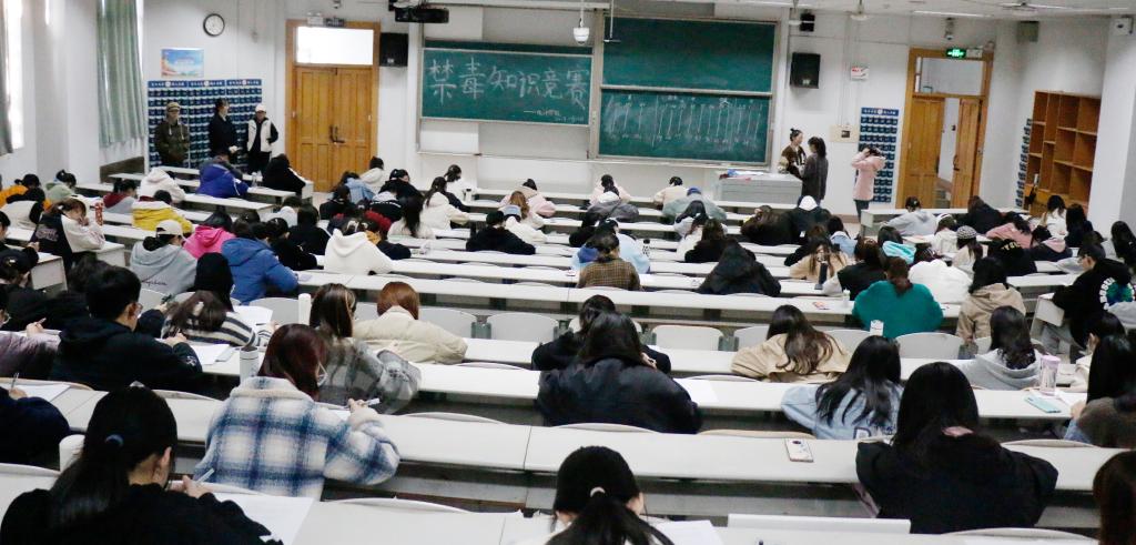 秘书处提前到达综合楼竞赛场地,进行了有序的布置。本次活动采取统一答卷的方式,竞赛试卷由选择题和判断题组成,内容覆盖面广,主要有毒品知识、毒品危害、毒品防范、禁毒法律法规、毒情形势、禁毒历史以及青少年毒品预防教育的相关问题。竞赛活动开始,各位参赛同学在自己指定答题位置上认真作答,严格遵守比赛规则。同学们在秘书处的监考下,于规定的时间内完成了作答。本次竞赛活动将评选出一、二、三等奖,鼓励同学们认真对待禁毒、防毒相关工作,提高对毒品的警惕意识。