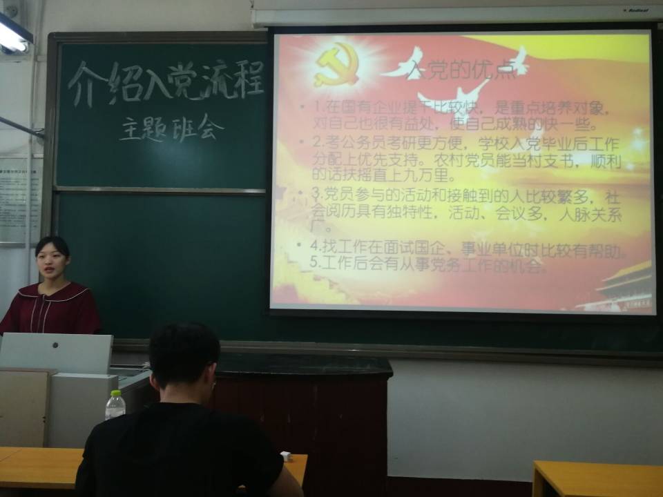 统计一班团支书李燕、统计二班团支书纪青林、应用统计班组织委员李灏三位同学精心准备,他们分别就入党程序中的发展对象的确定和考察、预备党员的接收和预备党员的教育、考察和转正等环节向同学们进行详细讲解和阐述。他们从正确的入党动机、党员标准等方面进行授课,详细讲解了什么是正确的入党动机、为什么要树立正确的入党动机、怎样树立正确的入党动机及要正确认识和对待党员标准,自觉接受党组织的培养、教育和考察等内容。