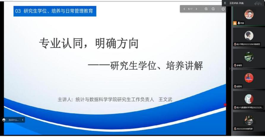 王文武开启系列活动第三篇章——研究生学位培养与日常管理教育篇。王文武以“专业认同,明确方向”为主题详细介绍了正妹