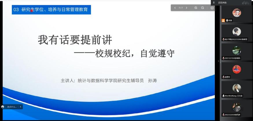 “做最好的自己——师长领航,规划生涯,研会宣讲”“‘强化安全,增强意识,关注心理’班会”“党员在线”“‘研究生如何做好科研’主题讲座”“‘新研途,新征程’——统计学类竞赛宣讲”等其他篇章的活动将在今后陆续开展。通过教育系列活动,相信同学们在未来的研究生生涯内会不断求真务实、开拓进取,开启一段充实而又难忘的旅程。