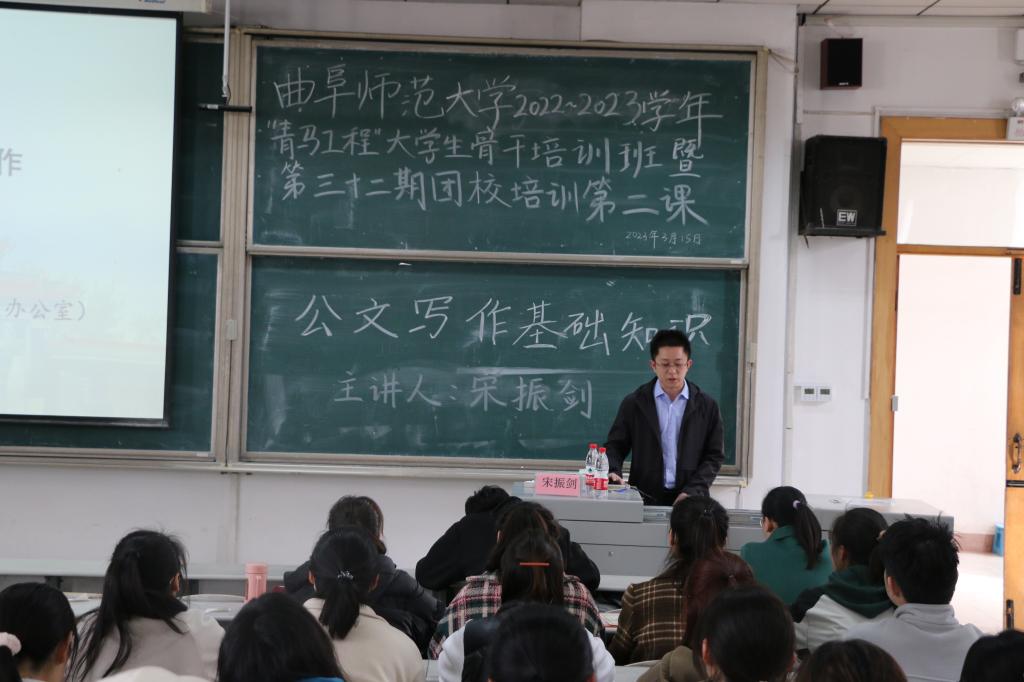 2022—2023 学年“青马工程”大学生骨干培训班暨第三十二期团校培训第二课——公文写作专题培训。此次培训由学校办公室主任宋振剑主讲,正妹