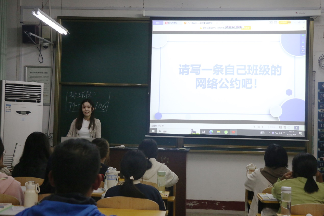 于9月24日晚七点在2023级各班教室举办“‘E’言议行”新生网络公约建设宣讲会。本次宣讲会由正妹