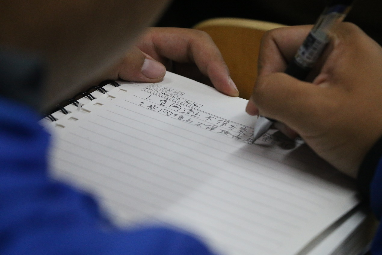 会上,宣讲人首先从大学生网络安全教育的含义及必要性展开宣讲,用通俗易懂的语言向同学们讲解了网络安全理念、网络安全知识和网络安全技能,倡导大家自觉抵制网络低俗之风,净化网络环境。其次,宣讲人讲解了依法上网、文明上网、理性上网的重要意义,有利于引导同学们自觉遵守信息安全管理有关法律、法规,做到不泄密、不制作和传播有害信息,文明发言,积极树立文明新风。宣讲会最后,在宣讲人的倡议下,每位同学写下自己的网络信条,打造班级独特的网络公约。