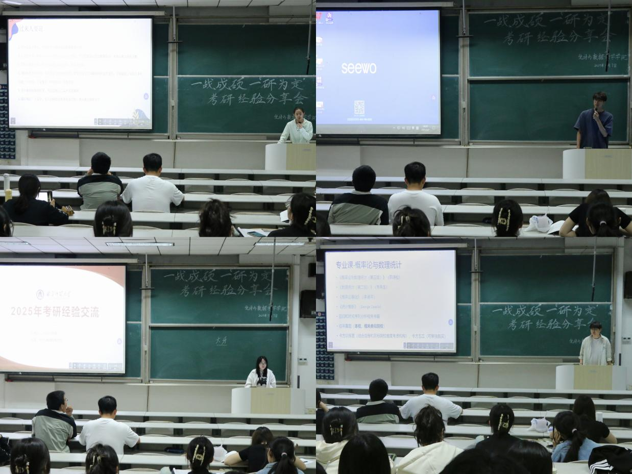 活动伊始,主持人致开场白,宣布本次活动正式开始,并向同学们介绍了现场嘉宾及此次活动的重要意义。随后,多位考研优秀学子依次向同学们分享自己的备考心得。分享过程中,吴泽宇着重推荐《张宇基础高数18讲》等数学一备考资料,强调错题复盘的重要性,并提醒大家专业课要吃透茆诗松教材的课后题;周文琪建议坚持背单词至考前,推荐唐迟阅读逻辑课等,同时她就复试的模拟面试向同学们提出建议;周灯则强调政治要反复刷黄皮书真题,紧跟徐涛政治课程,同时推荐了“大牙考研”公众号;陈珺和陶名杰则强调备考心态的重要性,同时向同学们分享了英语作文模板总结方法。
