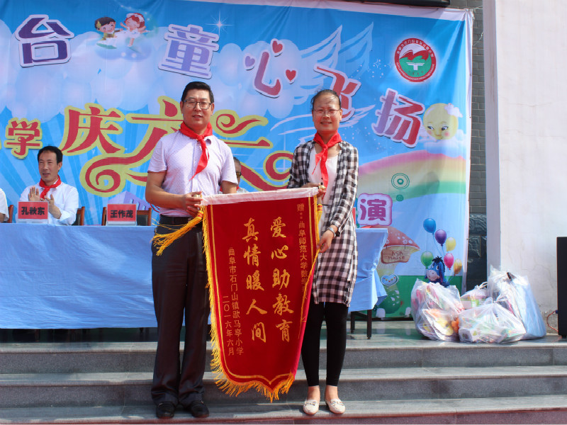 师生在本次活动中给贫困孩子捐赠了包括书包、文具等很多学习用品,歇马亭小学郝丽珍校长带领受资助学生代表对正妹
