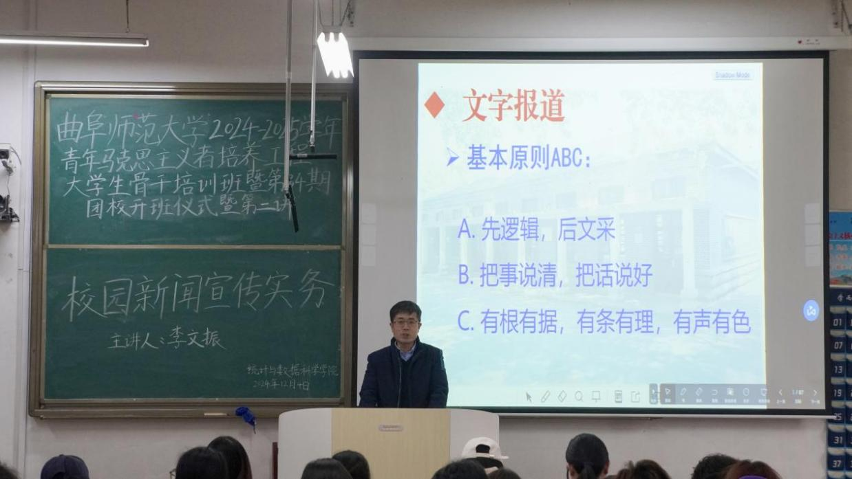 于2024年12月4日下午2:30在西联一教室召开2024-2025学年青年马克思主义者培养工程大学生骨干培训班暨第34期团校开班仪式暨第二讲——校园新闻宣传实务。会议邀请校宣传部李文振主讲,正妹