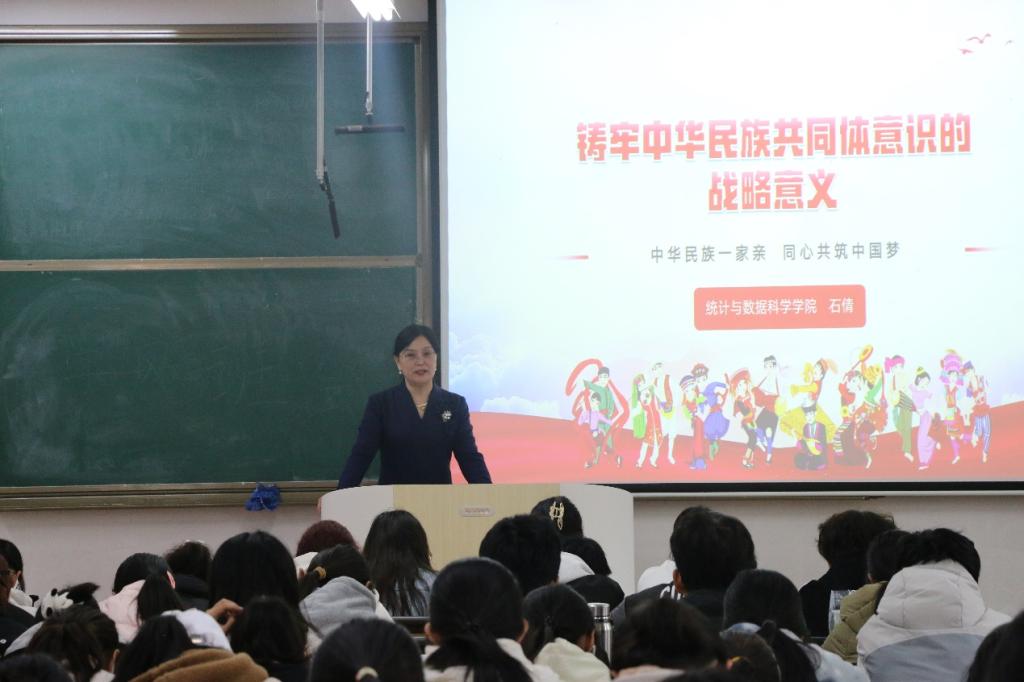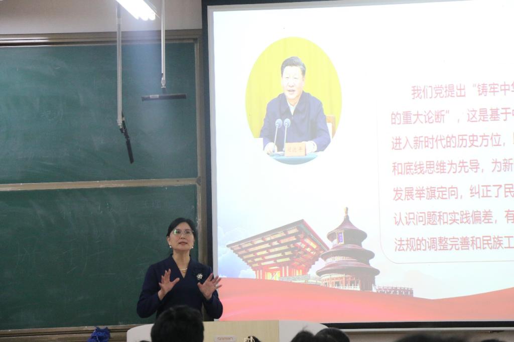 在以“铸牢中华民族共同体意识的战略意义”为题的思政课上,石倩书记引用习近平总书记关于民族问题的重要论述作为切入点,深入阐述了民族问题是影响中国乃至世界稳定和发展的重要因素。她指出,广大青年学生作为铸牢中华民族共同体意识的关键群体,要不断加强对铸牢中华民族共同体意识的学习研究,在面对全球化背景下的多元文化挑战,正确理解和处理民族关系,为维护国家统一和促进社会和谐贡献力量。