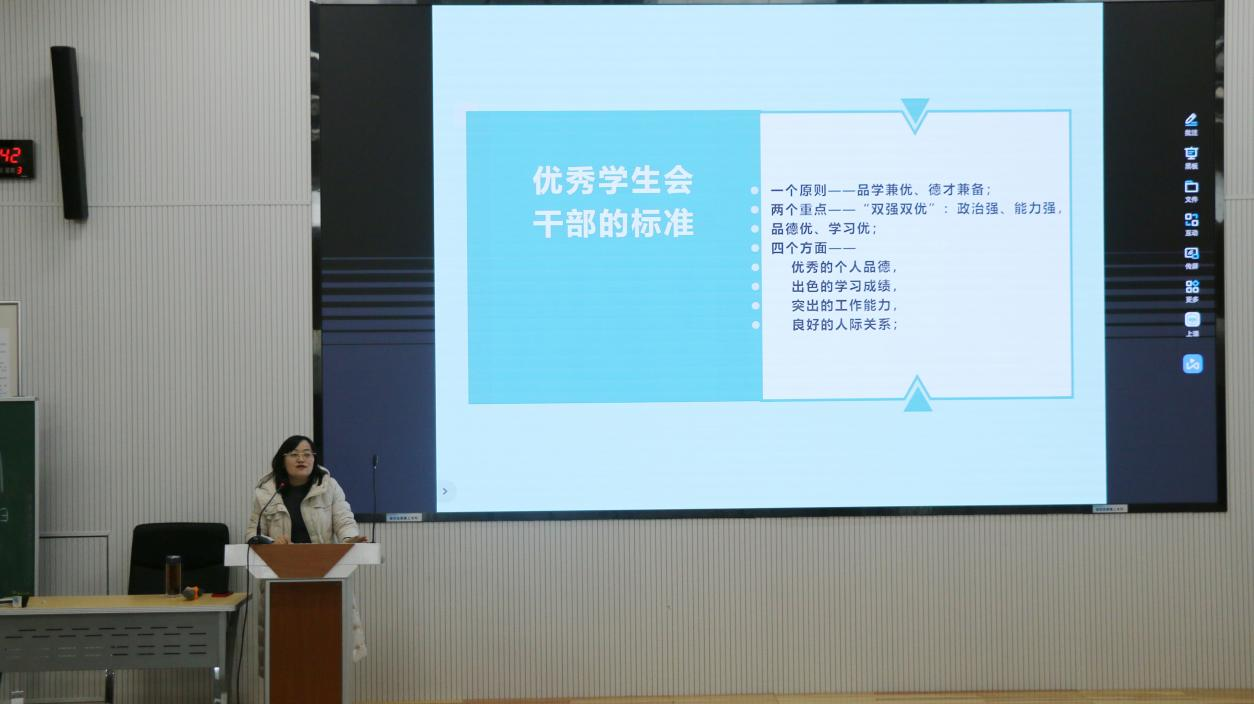培训伊始,李宴美书记着重强调提升学生会干部素养的重要性,明确指出学生会干部作为学生群体的引领者,不仅要在学术上树立榜样,更要在学生工作中全方位展现出色的综合素养与强烈的责任感,充分发挥模范带头作用。