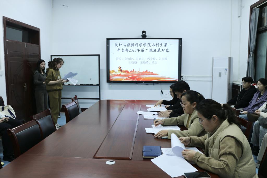 会议伊始,李宴美带领全体参会人员深入学习贯彻习近平总书记在庆祝中华人民共和国成立 76 周年招待会上重要讲话精神。围绕“实现中华民族伟大复兴是前无古人的伟大事业”这一核心,重点解读讲话中关于“党领导人民自力更生、接续奋斗取得彪炳史册辉煌成就”的重要论述,强调要从新中国 76 年发展历程中汲取精神力量,牢记“只争朝夕、永不懈怠的奋斗精神”,引导党员及预备党员深刻认识新时代青年党员的使命担当,切实将讲话精神转化为提升党性修养、强化责任意识的思想自觉与行动自觉,为后续党支部工作开展筑牢思想根基。随后,经过党支部党员讨论确定发展对象的条件。接着,培养联系人李宴美和李祥敏依次介绍董悦、袁如姣、宋炎亭、郭希璇、张雨璇、王晓晓、王晓晴、杨煦八位发展对象的情况。