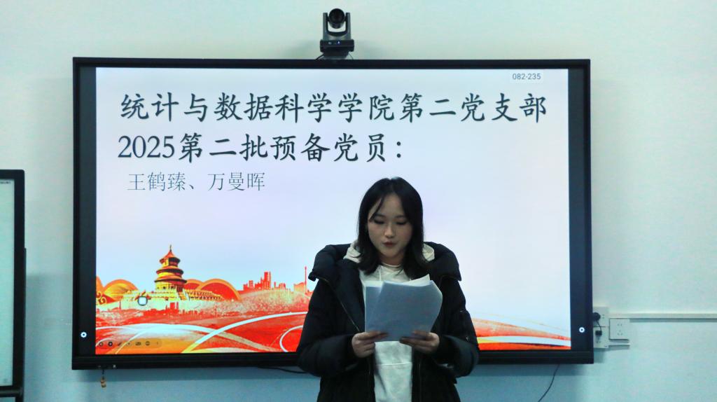 随后,由王鹤臻、万曼晖共两位发展对象宣读入党志愿书。接着,培养联系人季中和李文静同志依次介绍王鹤臻、万曼晖两位发展对象的情况并发表意见。按照党支部确立发展对象的流程,经在场党员及参会群众发表意见,并投票表决,一致决定同意上述两位同志为预备党员。