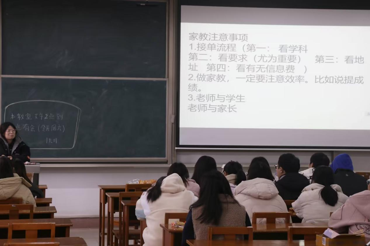 见面会主要流程包括师哥、师姐们的经验交流,以及大一新生的互相了解和提问环节。首先社团负责人对家教协会的基本概况做了简要介绍,表示家教协会是一个为大学生提供空闲时间兼职锻炼的平台,并简单介绍了家教协会的主要活动:大学生课件制作大赛和家协杯,让新成员们对家教协会有了一个初步的了解。接着,负责人对家教过程做了特别提醒,从自己的亲身经历出发,对时间、费用、辅导内容、沟通过程等多方面做了细致认真的讲解,让新成员们对家教有了更深刻的认识。最后,社团负责人针对成员们提出的问题做出解答,并给出建议,有利于帮助新成员们更快地融入家教协会,熟悉家教流程,成就更好的自己。