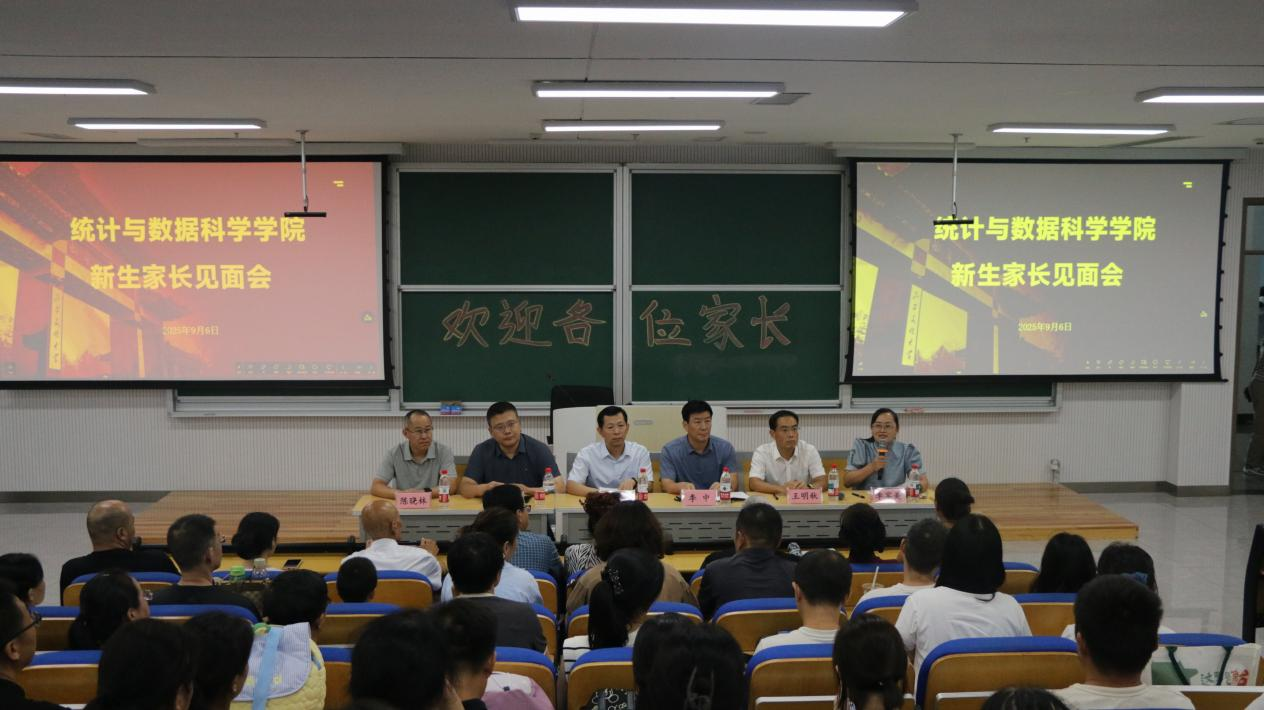 于致知楼B101举行新生家长见面会,院长赵胜利、党委副书记季中、副院长赵翔华、团委书记李宴美和统计系主任陈晓林、数据科学系主任王明秋,及2025级新生家长代表参加见面会,会议由正妹