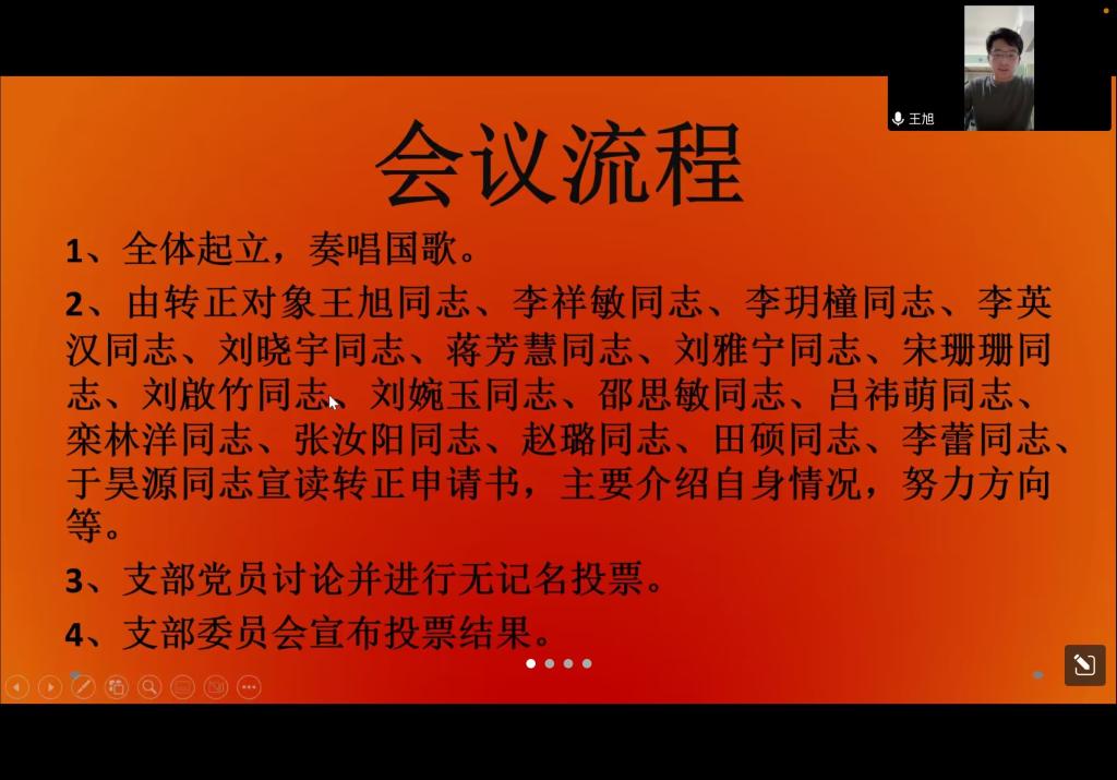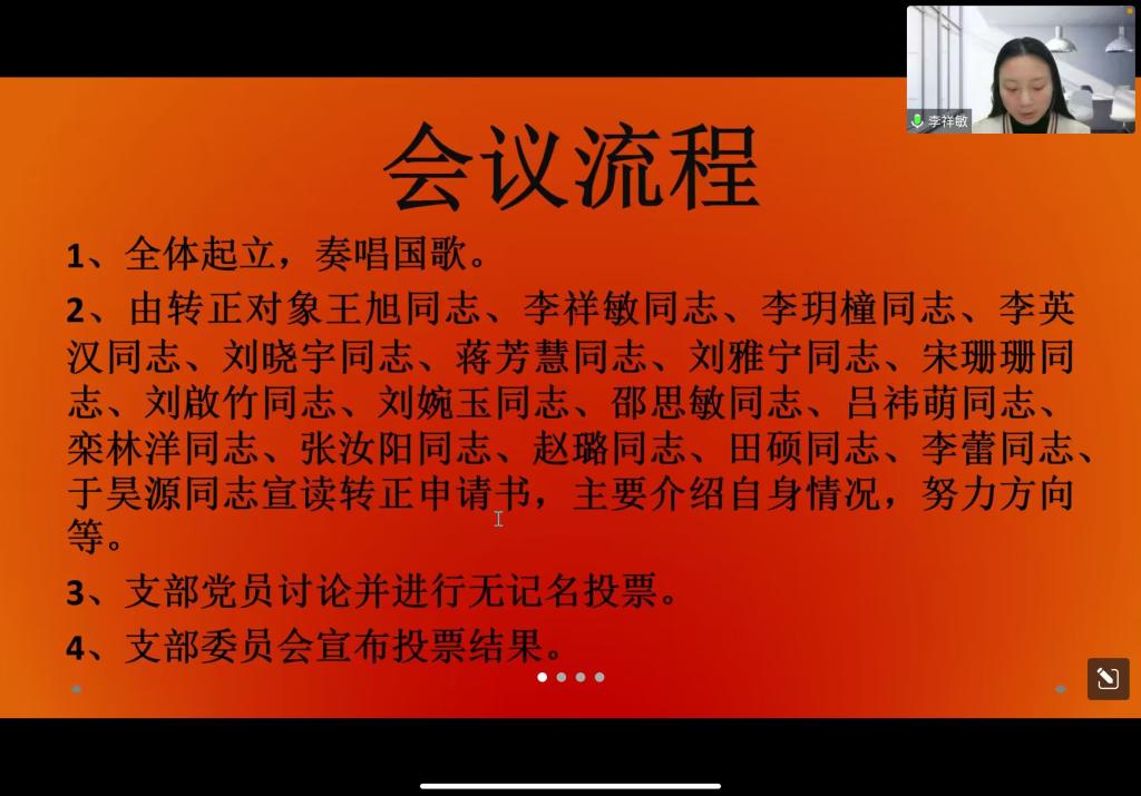 会议的主题是讨论王旭、李祥敏、李玥橦、李英汉、刘晓宇、蒋芳慧、刘雅宁、宋珊珊、刘啟竹、刘婉玉、邵思敏、吕祎萌、栾林洋、张汝阳、赵璐、田硕、李蕾、于昊源十八名同志转为正式党员的申请。本次会议严格按照转正流程进行,第一,全体起立,奏唱国歌,由王旭、李祥敏、李玥橦等十八名转正对象宣读转正申请书,主要介绍了自身情况,并且规划了成为中共党员后的努力方向;第二,本科生党支部党员讨论并进行无记名投票,大会一致同意王旭、李祥敏、李玥橦等十八名预备党员成为正式党员;第三,王旭、李祥敏、李玥橦等十八名预备党员进行宣誓;第四,正妹